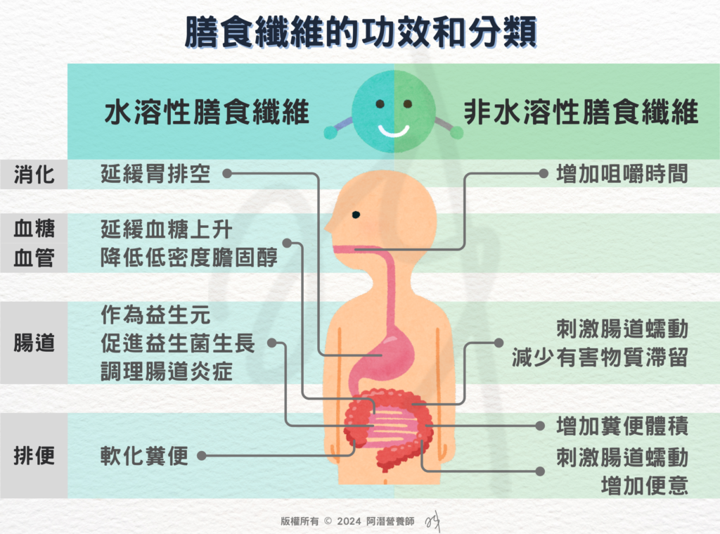 - 增加糞便體積:非溶性纖維吸水會膨脹,使糞便體積變多。