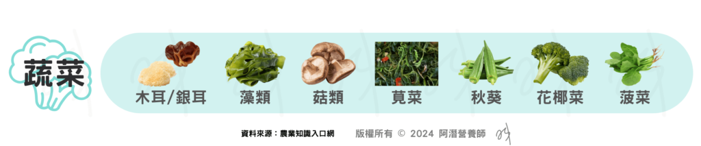 木耳/銀耳、藻類、菇類、莧菜、秋葵、花椰菜、菠菜